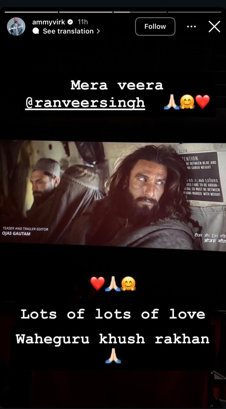 Punjabi actor and singer Ammy Virk recently joined this praise. He shared a picture of Ranveer from Dhurandhar on his Instagram story and wrote a warm message for him:-